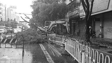 | 路边大树被大风刮倒,工作人员快速前来处理。 |