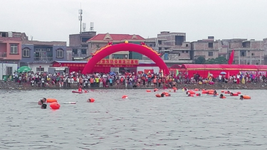| 由各游泳协会组成方队下水畅游南流江。 |