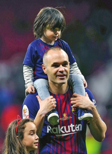 | 4月21日,巴塞罗那队球员伊涅斯塔在赛后和自己的孩子在一起。