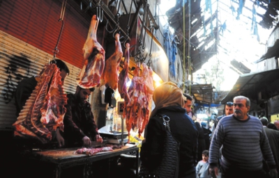 | 2月27日,在叙利亚首都大马士革,人们走过一处农贸市场 |