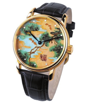 由北京表厂生产的“B24长走时系列”高级珐琅手动上链机械腕表,共计六款,其中四款高端产品为珐琅盘面的“福禄寿喜”,采用掐丝珐琅表盘的“福禄寿喜”精美的雕刻工艺,尤其松针都清晰可见。