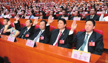 | ▲代表们举手通过各项决议。(记者 廖源 摄) |